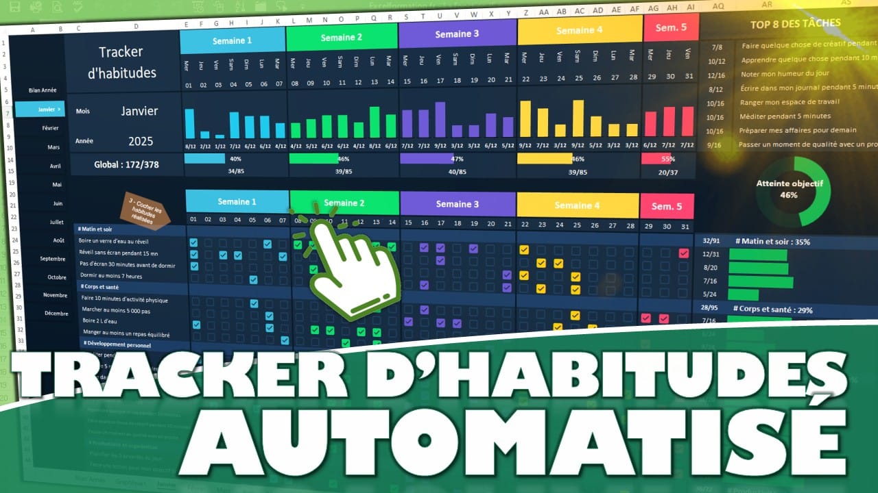 « Tracker d’habitudes by excelformation » est un outil Excel puissant et intuitif conçu pour vous aider à suivre vos habitudes quotidiennes de façon simple, visuelle et motivante.